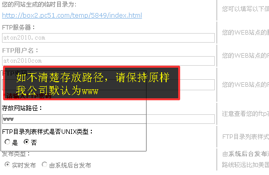 如果是独立购买的久久网络建站系统,还需要输入ftp服务器中的网站目录等信息,如不清楚请保持原样,或者咨询主机提供商业。